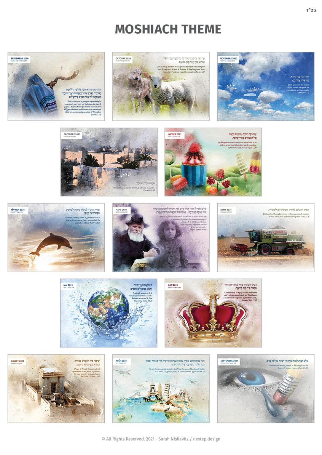 Moshiach times theme is made of 13 illustrations in digital watercolor style. It includes original passuk in hebrew, and English translation