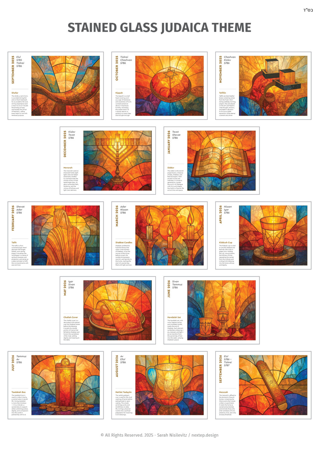 A visual journey through iconic Judaica objects, illustrated in a vibrant stained glass style. From the menorah to the kiddush cup, each page blends rich color with symbolic meaning, reflecting the beauty and holiness of Jewish ritual life.