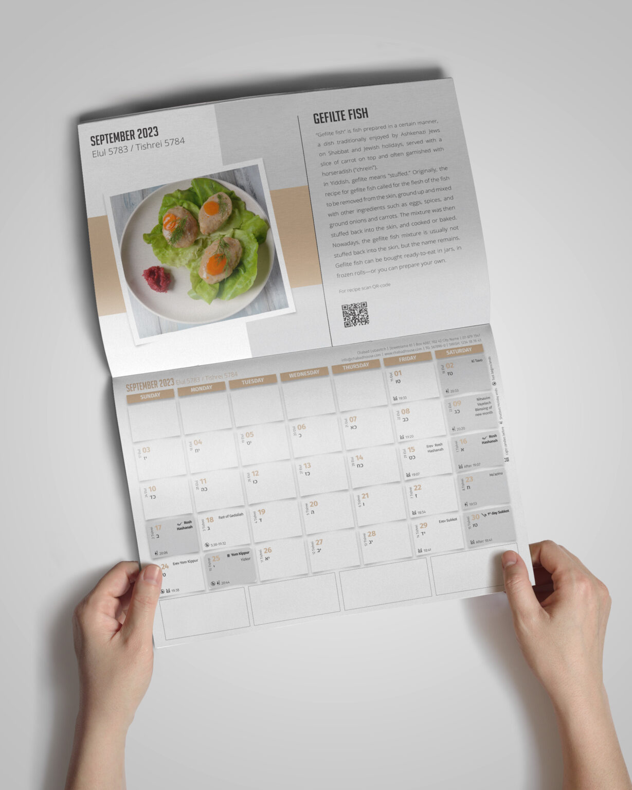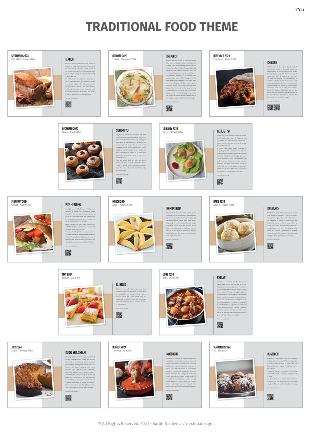 Traditional Jewish Food theme is made of 13 modern design pictures of traditional jewish food with an explanation in English, and a QR code linked to a recipe of this specific food.